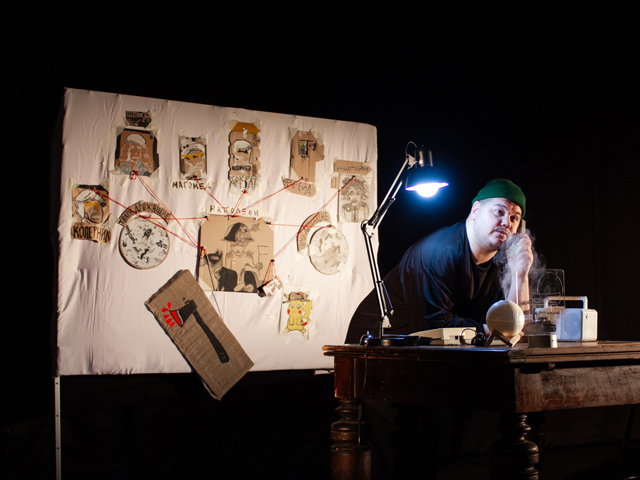 Пространство сцены заполнено реквизитом. Тяжеловесный стол каждой ножкой опирается на стопки книг — Порфирий напрямую соединен с мировым знанием. Ни одна улика не проникает в его кабинет, не будучи дезинфицированной, — для этого вывешен арсенал перчаток и масок. А для вхождения в поток Порфирий меняет асаны под столом и погружается в глубокое созерцание горы Фудзияма — настольный увлажнитель воздуха с подсветкой вполне справляется с этой ролью. Знаете теорию про «тварь дрожащую»? Он изобрел! Артист распахивает доску с портретами Коперника, Магомета, Эйнштейна, соединенными красными нитями расследования — и все они сводятся к картинке окровавленного топора. Искрометно цитируя мемы из соцсетей и явно кайфуя от себя на сцене, актер переключается из режимов глубокой медитативности и монотонности текстов Акутагавы в интерактивность с залом, в тактические переговоры с Раскольниковым по телефону, в комедийный сторителлинг. Фантазийный, ладно скроенный и сыгранный сюжет завершается репликами о следующем расследовании — на очереди некто Дмитрий Карамазов. И очередь эта не закончится никогда, потому что самурай Порфирий нашел свой икигай: не наказывать преступников, а возвращать баланс Вселенной в одном отдельно взятом человеке.