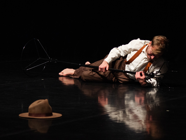 «Артист = тело». Спектакль Георгия Иобадзе из Москвы «Владимир Маяковский: Послушайте!» выстроен в жанре вольного ревю по стихам и воспринимается как стихийная живопись телом, которое штормит и бросает из одной краски в другую. Артист здесь — человек-оркестр, в телесной беспрерывности ловко жонглирующий музыкальными импровизациями на гитаре и клавишах, в языковом водопаде без пауз переходящий с грузинского на русский и обратно. Не важно, выдерживается ли стихотворный размер и ритм, — речь сама по себе превращается в музыку; не важны драматургия и сюжет — внимание захватывают импровизации идеального тела, берущего в партнеры то стул, то вешалку, то собственную ногу. В одном из персонажей, на которые распадется артист, угадывается некий соглядатай, наблюдающий за рождением живого слова, за тем, как тело корчится в попытках пропустить высоковольтный стих. И в целом, история — про иллюзию думать, что художник управляет своим даром. В «Маяковском» стихия поэзии хочет быть выплеснутой и играет ноктюрн на флейте-позвоночнике, и расплющивает, не спрашивая, тело человека.