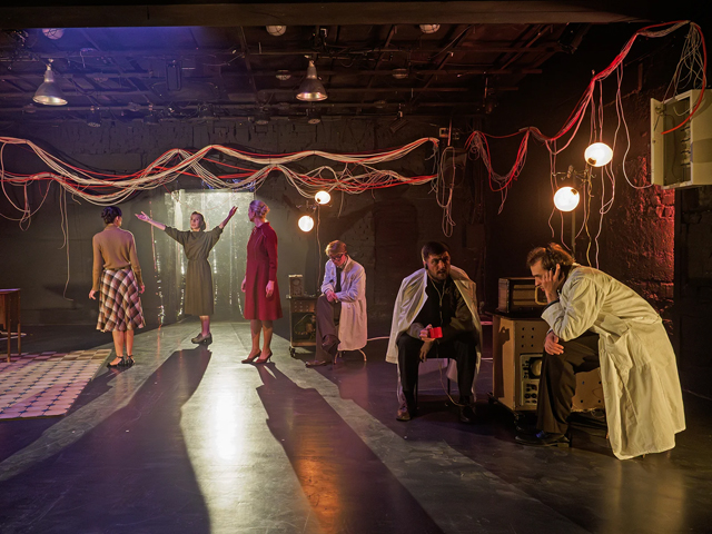 Художник Ольга Павлович создала то ли НИИ из советских фильмов, то ли секретную лабораторию из «Очень странных дел». Только обитают здесь люди из якобы нашего времени — мужчины в толстых свитерах под белыми халатами уверенно толкуют про искусственный интеллект (Александр Габура, Андрей Клочков, Кирилл Пчелинцев). Наверняка, в одной из альтернативных вселенных есть точь-в-точь такая комната.