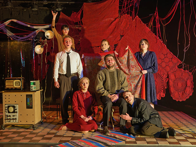 Алыми парусами обнимают героев сшитые в единое полотно вязаные салфетки, платки и скатерти. В этой уютной утробе мы слышим, как изменилась жизнь тех, кто тоже испытал на себе Елену. Калейдоскоп неприкаянных голосов доносится из разных точек мира: нянечка из детского сада на краю земли, самка дельфина, оплакивающая убитого дельфиненка, бывший священник, изгоняющий бесов из травы и листьев. Актеры ловко переключаются между ролями, для каждого героя находя свой характер и ритм.