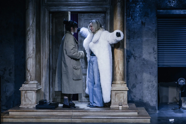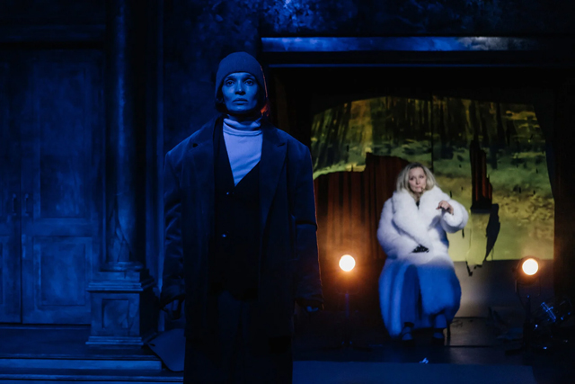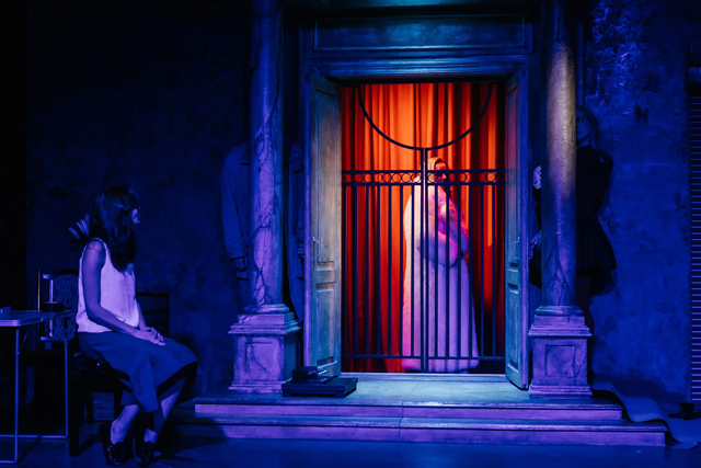 Когда занавес открывается, за ним — порог или преддверье. Слева — классицистский фронтон здания с дверью по центру, напоминающего скорее мавзолей, нежели дом; справа — металлические подъемные ворота гаража. Двери, ворота или занавесы, раскрываясь, обнаруживают другую «завесу»: экран, на который проецируется грубая симуляция автобана, по которому на «автомобиле» едет Шарлотта. За грубо растерзанным в какой-то момент экраном из крафтовой бумаги — фрагмент красного бархатного занавеса. Точно так же, раскрываясь, двери «дома» обнаруживают металлическую ограду, вроде кладбищенской, а за ней опять — фрагмент красного занавеса. Позже картинку дополняет мраморная гробница Эрика, утонувшего маленького сына Евы и Виктора, выезжающая из ниши слева. Сценография Константина Соловьева дает очень точный ключ к происходящему.