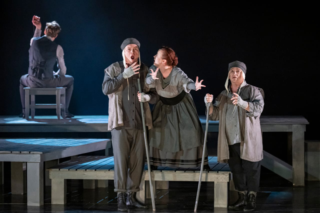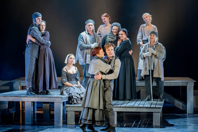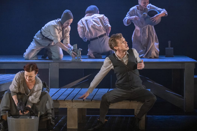 Фарсу не нужны декорации. И на сцене — только несколько серых помостов (молодец художник Александр Карпов, меньше возить на склад, — подумала я, зная технические трудности СХТ). Но фарсу нужны костюмы — и художник Денис Шевченко отлично одевает персонажей в серо-пыльное, черно-пепельное, коричнево-выцветшее, бежево-блеклое, графитно-застиранное (все это колористически напоминает Марию Данилову в «Школе жен» — и отлично!). Действие тихонько подзвучено музыкой, ритмичными щипками по струнам, создающими ритм.