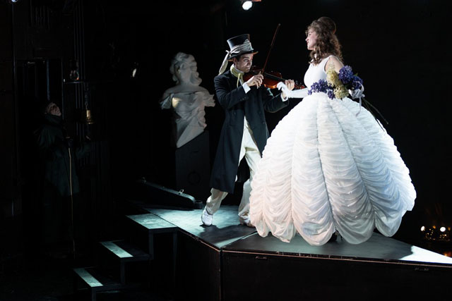 Он, Мечтатель Василия Гетманова — черное пальтишко, черный зонтик-тросточка и намеком подведенные черным глаза. Иногда мечтаются мальчишеские идеалы: немножко Ален Делон или — котелок на голове — немножко Вертинский? А желтый клоунский пиджак в одной из сцен — бутусовский Арлекин? Она, Настенька Ангелины Столяровой — белый кринолин, блондинка из блондинок, куколка из куколок. В середине спектакля помечтает — примерит черную шляпу с траурными перьями: немножко Прекрасная Дама? Но шляпа к нежному румянцу отчего-то не идет — уместно разве что перышко. Кринолин — не кринолин, а «маленький» — всего-то потрепанная занавеска. И пиджак, Мечтателю и так не по размеру, прямо титанический груз на тельце, которое тоже именно что «маленькое» — зациклено в одном маленьком жесте: актер непрерывно трясет кистями рук, пытаясь донести до партнерши душевную неизъяснимость.