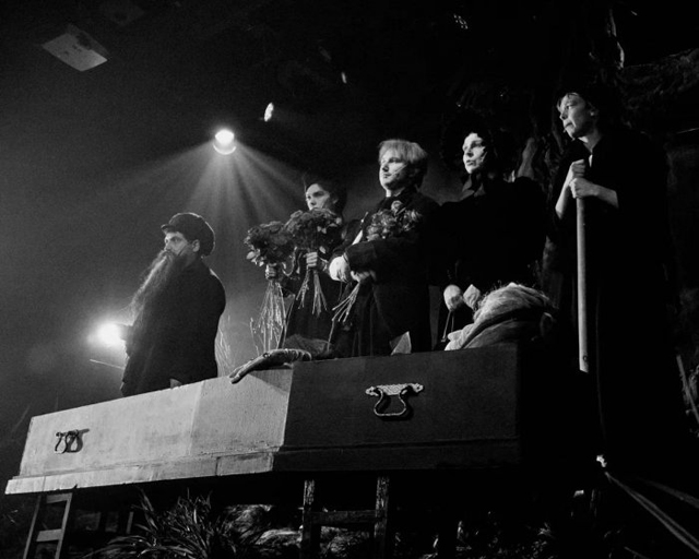 Гроб огромен, как нос и руки лежащей в нем старухи Яги. Над ее телом собираются близкие. Но похороны привычно перетекают в скандал, откровенный и безобразный, впрочем, никуда не ведущий. Просто жизнь. Тут скандалы и крики норма. Персонажи одеты в подобие исторических костюмов, но, как и все действие, гротескных и символичных. Однако в репликах цитаты из текста Островского возникают среди абсолютно новой современной речи, где мелькают слова «МФЦ», «экономический форум», «навигатор». Кто именно сочинил текст новой пьесы, в которой персонажи Островского и узнаваемы, и в то же время пересобраны в другой ментальности, понять не удалось, хотя очень хочется. Явно, что идея родилась в воображении Марии Смольниковой, которая как раз с Островского начинала свою актерскую жизнь: ее студенческий этюд по пьесе стал основой спектакля Дмитрия Крымова «О-й. Поздняя любовь» в ШДИ. Там похожая, взвинченная до крайней степени, органика обнажала лежащий в основе пьес классика народный театр масок. И здесь, в новой «Грозе» возникает этот стиль ярмарочного Петрушки — смесь канона и импровизации.