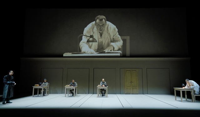 Двадцать шесть сцен допросов разложены на добрых тридцать ролей допрашиваемых в исполнении двенадцати артистов. У кого-то по две роли, а у кого-то — четыре. Но большинство актерских работ — штриховые наброски, емкие портретные зарисовки, предполагающие калейдоскоп, но не развитие характеров. Вот Маттиас Редхаммер в роли Римского — поддакивает следователю, услужливо поднимает обороненную тем ложку из стакана, теребит портфель. И он же в роли супруга Маргариты — надменный, самоуверенный функционер, досадующий на сам факт допроса и бессмысленную потерю времени. Михаэль Шютц в роли бухгалтера варьете — хитрован мелкого разлива, лукавящий «по требованию», лишь бы выйти сухим из воды. И он же в роли соседа Маргариты Николая Ивановича срывает почти бенефисные аплодисменты за утрированную до комичности законопослушность: его наивное рвение сообщить следствию все подробности о полете в теле борова на бал Воланда и полное фиаско следователей выглядят как раз насмешкой авторов спектакля над всегдашним тугодумием сотрудников органов перед лицом непознаваемой (творческой) реальности. Если додумывать смену личин московских жителей, то недалека мысль о том, что выжить можно, лишь пряча истинную суть и прикидываясь — то рьяным помощником государственной системы, то наивной бабенкой, то благообразной дамочкой, то равнодушным созерцателем. Где правда, не разобраться не только следователям, но и самим жителям, запутавшимся в вынужденном хамелеонстве. Лишь один на допросе — всегда он сам, не меняет личины и всегда не столько отвечает на вопросы, сколько говорит с самим собой и — уже — с вечностью. Иван Бездомный Кристофа Борнмюллера изначально существует в антагонизме ко всем костюмированным участникам представления: в белой рубахе, белых мятых штанах и пиджаке, с отрешенным лицом, мучительной внутренней работой памяти. Иной по речи, по пластике, по отношению к следователям, по образу мысли. Его единственный мотив в диалоге со следователями — прочесть финал романа Мастера, заглянуть на последние страницы той рукописи, которой дразнят его следователи.