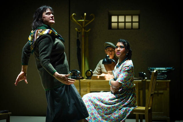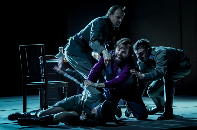 Допрос как структурная единица композиции франкфуртского спектакля и одновременно метафора выжатой, несвободной, схлопнувшейся до формата «вопрос-ответ» жизни работает на идею тотального соглядатайства, животного страха перед системой и любым соприкосновением с государственной машиной.