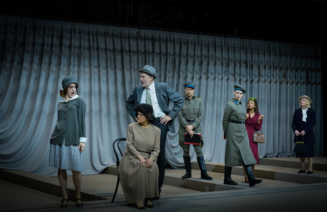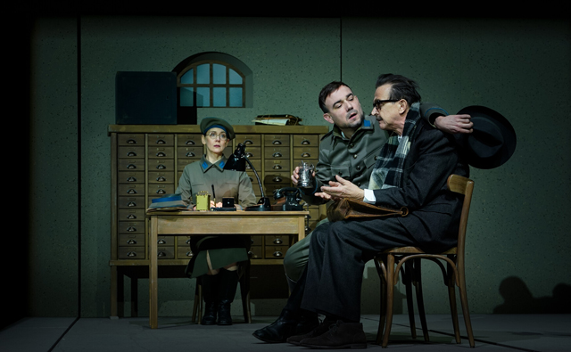 Концепт спектакля считывается быстро и недвусмысленно отсылает к следственной практике тоталитарных систем. Параллели не умозрительны и в Германии более чем понятны: власть людей в униформе — по-прежнему страшный и не изжитый кошмар немецкой истории, и, в свете последних распределений мест в региональных парламентах, не такой уж фантастический сценарий ближайшей реальности. Но на актуальные параллели удобнее закрыть глаза — в текстах программки театр ясно дает понять, что в спектакле речь идет о советской практике давления на свободу высказывания.