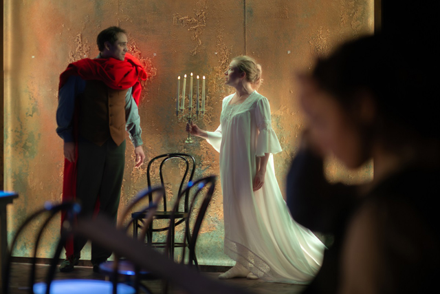 Марина Солопченко — бабуленька, Петр Семак — генерал. Какие звезды! Какие могли бы быть дуэты и трио с Коробициным. А по факту Солопченко загнана в жесткую форму деревянной куклы с набеленным лицом, неестественным голосом и нелепой походкой, в устрашающем парике и невероятных фижмах. Семак же загримирован до неузнаваемости и лишен какой бы то ни было сути роли, и только ближе к финалу все же пробьется сквозь грим и невнятицу режиссерского разбора и сыграет любовь, отчаяние и бессилие так, как умеет только он, до общего вздоха в зрительном зале.