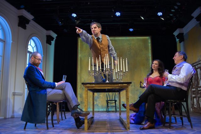 Тройственность авторства Сенина вписывается в концепцию. «Игрок Достоевского» — очевидный триптих. Три акта, три реальности, три состояния, три составные части, три источника. Каждой части — своя эстетика. Первый акт неспешен и традиционен: люди чинно пьют чай и носят свои сюртуки, далее по тексту. Второй акт — жутковатый театр кукол: здесь царит яркая бабуленька, а к отъезду ее, проигравшейся, балаган разгуляется до абсурда — поскачут на деревянных лошадках француз и англичанин, и выйдет, покачиваясь, верный лакей Потапыч в алом кафтане с позументами и тяжелой медвежьей головой. Третий же акт — сплошной недорогой кафешантан с удручающе громкой музыкой, женским визгом и скверными танцами. Экспозиция-кульминация-развязка, Явь-Правь-Навь, день-сон-смерть, жизнь-чистилище-ад и так далее. Три образа Алексея — мелкий бес, демон летящий, демон поверженный. Три образа Анны — неясно зачем, но пусть. В ключевых сценах неизменны три основных действующих лица, и даже если это диалог двоих, третий молча наблюдает в стороне. И вот это повторяющееся «раз-два-три», этот дьявольский вальсок — отличный ход для прочтения Достоевского.