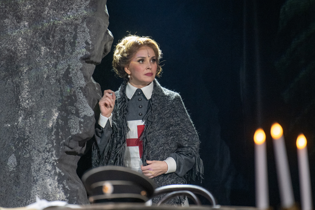 Репертуарному спектаклю сложно обзавестись сценической механикой уровня «Норд-Оста», и «Святая Анна» в основном обходится сборной имитацией носа корабля, поднятого достаточно высоко, чтобы сделать танцы рискованными. Эта палуба при необходимости раздвигается на части, а когда необходимо обозначить начало войны — разворачивается и превращается в броневик. Фальшборт палубы поднимается, становясь то храмовым сводом там, где храма нет, но есть молящиеся, то устремленной вперед огромной свободной птицей. Проекции морских карт Севера и беглые строки рукописных документов якорят спектакль в реальности — а за поэзию отвечают безумные миражи в ледяной пустыне и уходящие в непрорисованные текстуры пейзажи. И никуда никогда не исчезают обрамляющие сцену подсвечники. А свечи в них, без сомнений, горят поминальные: в честь тех, кто погиб в морях, и тех, кто рассказывал их истории.