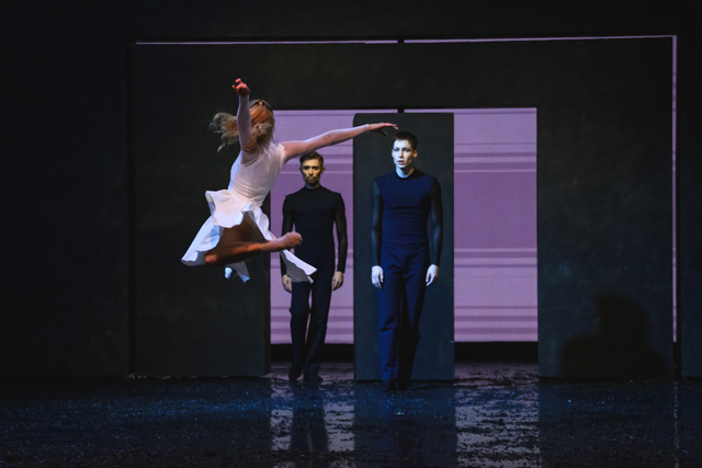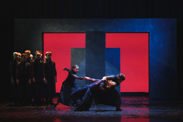 Из этой темной субстанции хореограф выхватывает отдельные сюжетные линии. В первую очередь, трагический дуэт Паоло и Франчески, пытающихся урвать секунды счастья, пока безликая масса не растащит их в разные стороны. Дуэты главных героев, сосредоточенные, нежные, яростные — Данте с Вергилием, с исчадием ада Плутосом и, конечно, с Беатриче — становятся центрообразующей конструкцией спектакля. Действие завершается райским торжеством: под финальную часть «Реквиема» — Lux Aeterna — бесформенная масса обретает гармонию, юноши и девушки объединяются в пары и сливаются в общем танце, ведомые Данте и Беатриче.