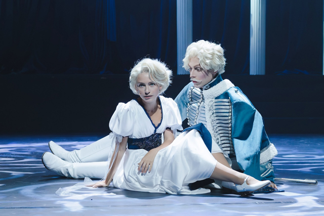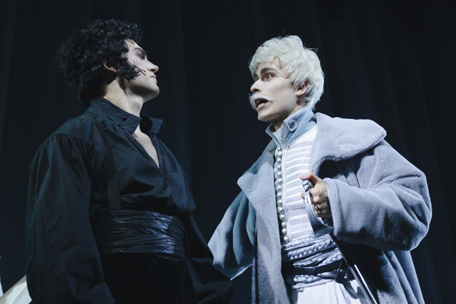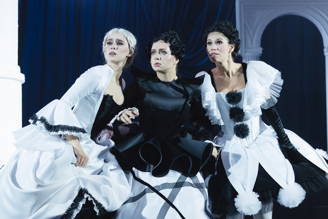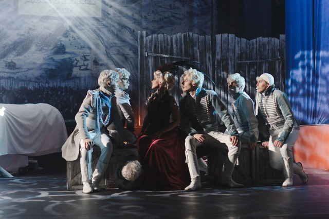Пространство гусарской истории лишено не только изящества, но и художественного смысла. Если в начале еще есть воздух, то потом приезжает большая белая пушка. Она весьма условна, символизирует собою суровые реалии войны, занимает треть сцены и используется в основном как вешалка. Люди на ее фоне мелки и невнятны и вдобавок легко с нею сливаются. Потому что для пущей сувенирности все хорошие одеты в светлое, от белого до бледно-голубого, и в плохо сделанные блондинистые парики, а все плохие — в темное, от синего до черного, и все как один брюнеты. Чтоб зрителю не путаться, кто тут наши. Это забавно, но превращает массовые сцены в приятное движущееся пятно, особенно когда наши собираются вокруг пушки. Чтобы окончательно заполировать ощущение китайской подделки, свет поставлен так, что в половине монологов у артистов нет лица. И хочешь узнать, что он там важное и значимое вкладывает в текст, — а не получается.