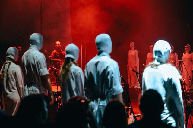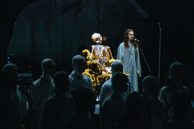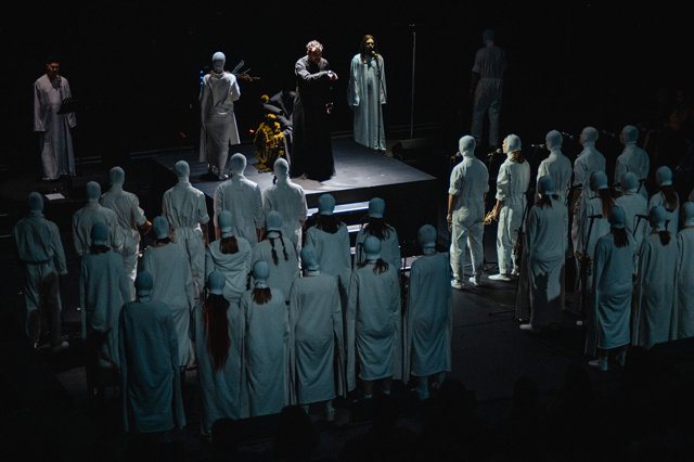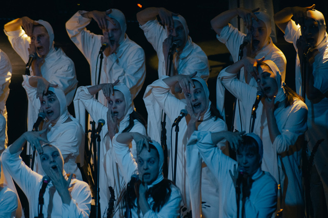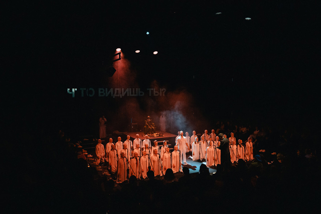 Хор весь спектакль балансирует между ощущением мнимой надежды и страха. Первая картина с песней «La La End» задает исходные: «после запоя чистое поле», «чистая сила весна наступила», «бодрые руки, откройте мне веки» — исходный «чистый» мир, но тревожащий ощущением надвигающейся катастрофы. Хор раскладывает песню Бомбы-Октябрь на два плана: протяжное басовое звучание накладывается на высокие женские голоса. Повторяющийся, словно зацикленный, финал «любите меня» становится воплощением веры «слепых» в надвигающееся счастье (которое станет божественным спасением), а не трагедию. Но счастье сменяется тревожным «Месяцем» Polina. Преобладающие мужские голоса под давящий бас развивают ощущение подступающего краха, «такой пустоты».