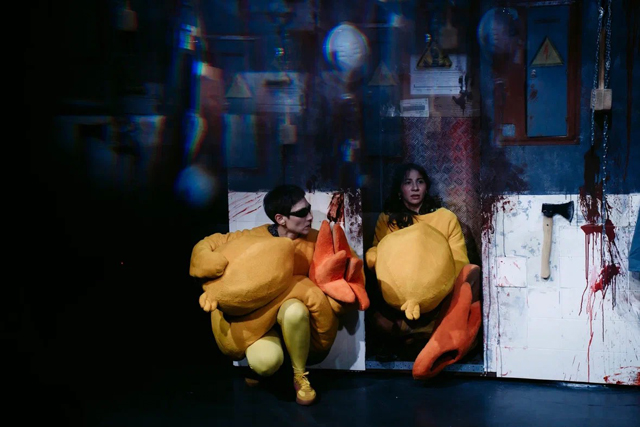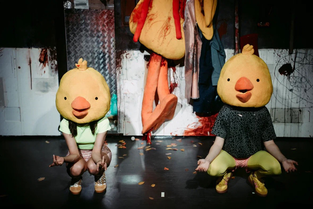 Затворника играет Анастасия Радвогина. Шестипалого — Ай Ахметова. Это две отличные актрисы, прекрасно чувствующие стихию текста, полного внутреннего сарказма, иронии, печали, и абсолютно серьезно проживающие этот текст, доводя до хохота аудиторию, но ни разу не веселя ее. Затворник в исполнении Насти Радвогиной ощущает себя носителем сакрального знания, добытого мучительно и трудно. И он сначала с неохотой делится этим знанием с бестолковым цыпленком, вполне презирая его, хотя и жалея как изгоя. Его собственное одиночество выбрано как некий путь. Он такой интеллектуальный бунтарь, поначалу довольно высокомерный. А Шестипалого изгнали за уродство, и он трудно преодолевает это изгнание. Так же тяжело, как ребенок, который оказывается изгоем среди детей из-за рыжего цвета волос или торчащих ушей. Шестипалый и есть куриный ребенок. Ай Ахметова играет абсолютную веру и преклонение перед Абсолютным Знанием Затворника. Но играет и мучительность роста, пубертатные метания цыплячьего подростка, про которого пока даже непонятно, девочка это или мальчик. Похоже, что девочка, по каким-то моментам кокетства, но бог его знает (я имею в виду, конечно, куриного бога!).