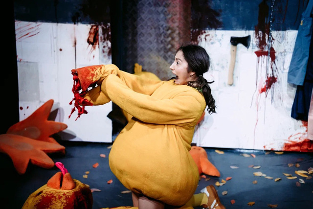 В отличие от текста Пелевина, где не сразу понимаешь, кто эти философы, рассуждающие о небесных светилах, о прибежище души, о Стене Мира, в спектакле с самого начала появляются два желтых куренка, чтобы сразу внести ясность. Постепенно они снимают с себя куриные головы, куриные тела, как будто проявляя свою сущность, хотя не хочется называть ее человеческой. Потому что люди здесь боги, но они же и убийцы. И это тоже потрясение для Шестипалого, когда Затворник открывает ему страшную истину: «Мы их пища». Я даже не помню, есть ли эта фраза в спектакле, но ужас перед богами, чьи огромные лица и хриплые голоса появляются на курином небосводе, играется актрисами так, что прямо во время действия клянешься себе больше никогда не притрагиваться к куриному мясу. Хотя Затворник с этим страхом привык справляться, а вот Шестипалый увидел богов впервые. Да он все видит впервые. Постигает мир! А он огромен и враждебен — мир бройлерного комбината имени Луначарского. Кстати, о Луначарском. Все-таки очень радует то, что именно именем первого наркома просвещения (а он был именно наркомом Просвещения, а не то чтобы культуры!) назван бройлерный комбинат, в котором яйца проходят весь жизненный цикл, а заодно посвящаются в тайны мироздания.