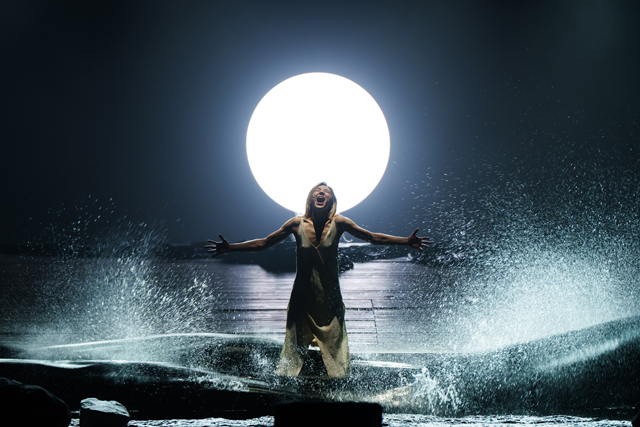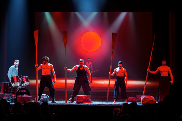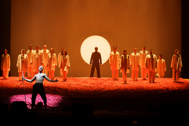 Итака в спектакле — остров, где ничего нет, это выжженная земля, опустошенная за годы отсутствия Одиссея. Художник Евгений Терехов выдвинул вперед просцениум, закрывший несколько рядов кресел, и расставил по нему огромные камни — древние свидетельства того, как человечество раз за разом пытается себя уничтожить. Позади просцениума — огромное пустое пространство, деревянный помост, наклоненный в сторону зрительного зала; по нему в начале по кругу ходят жители Итаки — неприкаянные люди, словно застрявшие в сомнамбулическом сне, — а потом спускаются на Одиссея герои его видений — павшие друзья или мифические существа, с которыми он встретился по пути к дому. В самой глубине висит огромный светящийся диск (то ли солнце, то ли луна) — главный элемент сценографии, который непременно притягивает к себе взгляд. Он окрашивается разными цветами — красным, белым, золотисто-желтым, и совершенно завораживает своей сдержанной красотой — так здесь день сменяется ночью, а ночь сменяется днем, и идет бесконечная череда несчастливых для всех дней и ночей.