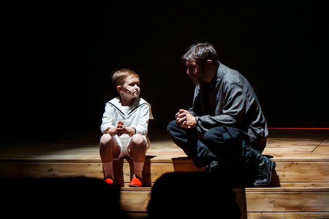 События спектакля — это либо то, что происходит в настоящем — собрание горожан, объяснение Пенелопы с женихами, встреча Одиссея под видом путника с Телемахом и другие; либо то, что происходило в прошлом — тревожные воспоминания Одиссея, например, сошествие в Аид и разговор с матерью, которую Ирина Кривонос неожиданно играет воинственной и непреклонной (она, словно Афина, пытается убедить Одиссея в том, что война необходима), или там же встреча Одиссея с собой маленьким (дебют очаровательного Тимура Овечкина) и попытка понять, в какой момент он ступил на указанный путь и был ли у него выбор. Если представлять композицию графически, то получится множество кругов, наплывающих друг на друга: Марк Букин загадывает зрителю загадки и предлагает разобраться, случаются ли события в реальности, или же это игра воображения героя. Например, Одиссей падает на колени за спиной уходящей от него Пенелопы и отчаянно кричит «прости меня!», но к этому времени он еще не открылся ей и объяснение между ними не состоялось; или же он рассказывает о своих странствиях, и в оживших картинах среди членов его команды появляется Телемах, как будто путешествует с отцом, но в действительности этого быть не могло.
