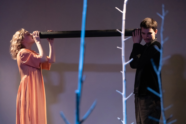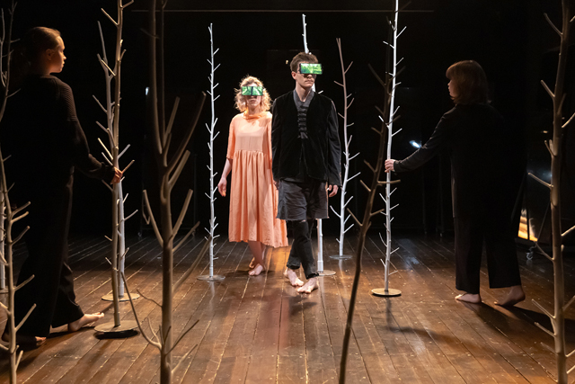 Мастерская рука художника коснулась этого спектакля будто перышком — Эмиль Капелюш и Роза Гиматдинова придумали пространство из редких голых белых стволов, реальных деревьев, взятых из леса и воткнутых в фанерные подставки. Часть свисает из-под потолка, часть можно произвольно передвигать. Был ли тот лес когда-то у этих зверей, или это то, что они бережно, пока еще это возможно, хранят как воспоминание о некогда живой Земле? Взойдет ли солнце в этом темном мире, или им так и придется запускать движение тени от солнечных часов посредством ручного фонарика?