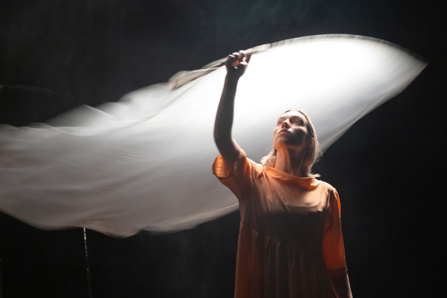 Выразительный арсенал этого спектакля обширен и колеблется от масштабов театра на ладошке, когда речь заходит о Червячке, до размеров монструозной Тли, которая составлена из двух актерских тел (последняя сыграна блистательно и оказывается застенчивым многочленным существом, не знающим, куда деть свои руки-ноги, и мечтающим о запахе меда). Он звучит медитативными переливами колокольчиков и капели, пением птиц, звуками неведомых дудочек, струн и бубнов.