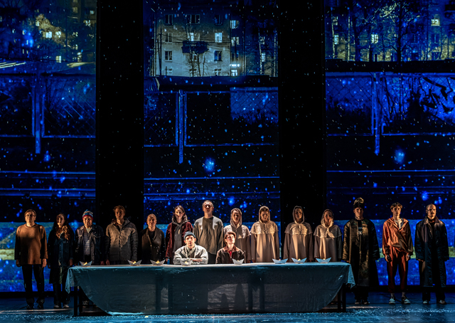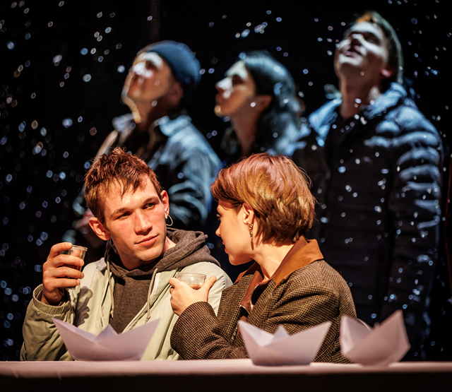 Несмотря на отказ от линейного нарратива, который при автоматическом восприятии может казаться затруднением, спектакль обладает потенциалом открывающегося мира, если с ним сердечно сонастроиться. Его структура разомкнута: нет границы между первой-второй реальностями, сцена и зал практически неделимы — мы все попутчики, оказавшиеся в одном вагоне электрички. Каждый сам выбирает, доехать ли до конца, или сойти на ближайшей станции. «Добро пожаловать. Может быть, вы отсюда больше не уедете». Среди попутчиков — три студентки (Юлия Ильина, Екатерина Куликова, Дарья Чехова), из которых каждая расскажет свою исповедальную историю; бродячие музыканты (Сергей Тупогуз, Владимир Розанов / Арсений Кирюхин, Николай Горшков) да заколдованный юноша, обреченный до поры носить ростовой костюм белки (Дмитрий Шумаев).