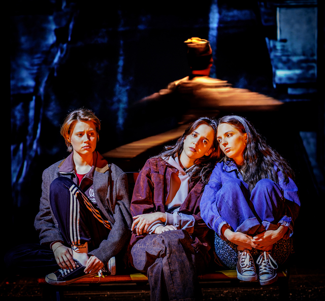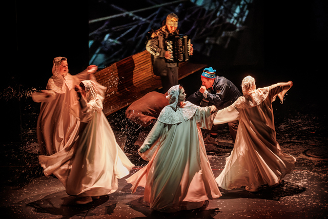 Надбытийный слой в спектакле организован музыкально композитором Олегом Гудачевым. Артистки хора musicAeterna — Екатерина Имсоква, Виктория Рудакова, Альфия Хамидуллина — не то три царевны, не то райские птицы. Выплывая из зала или оказавшись под небесно-голубым куполом царской ложи, своим пением они, словно золотыми нитями, прошивают пространство и эпизоды спектакля, не давая хрупкому миру рассыпаться. Убаюкивая и присматривая за героями, в более тесном сосуществовании с ними находится хор ангелов (Алена Кучкова, Варвара Павлова, Александра Соловьева, Екатерина Старателева). Медитативный покой, пограничье между сном и явью, сменяется лихвой и удалью, которые вносят два танцора (Антон «Barocco» Кулешов и Егор Фомин) — в танце они вихрем закручивают все пространство так, что не оторваться (хореографию ставила Александра Киселева) — «от беды / от вины / от дурной головы / отрекались тихо / танцевали лихо» (Shortparis, «Шире Волги»).