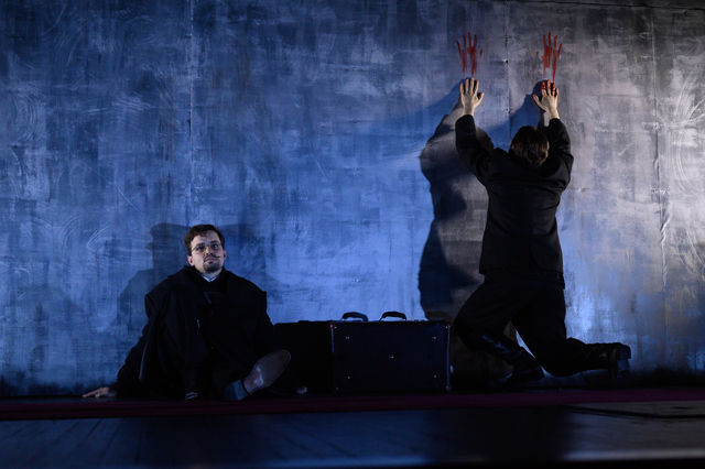 Эта рассказчица, советник и свидетель дел главного героя, так и обозначена в программке: Совесть. Верхняя часть ее лица выбелена, волосы гладко зализаны: этот внутренний голос героя, его соратник и его трагический двойник, никому не виден, кроме него самого.