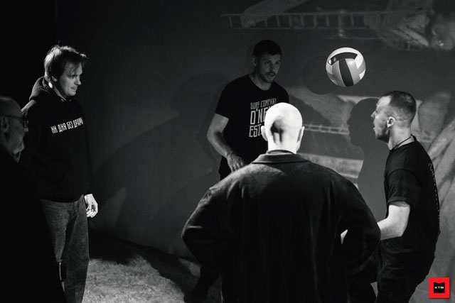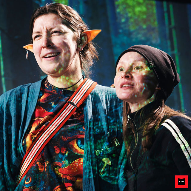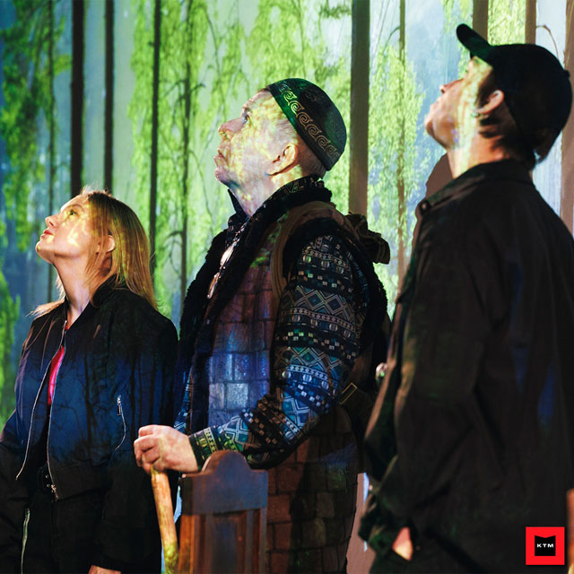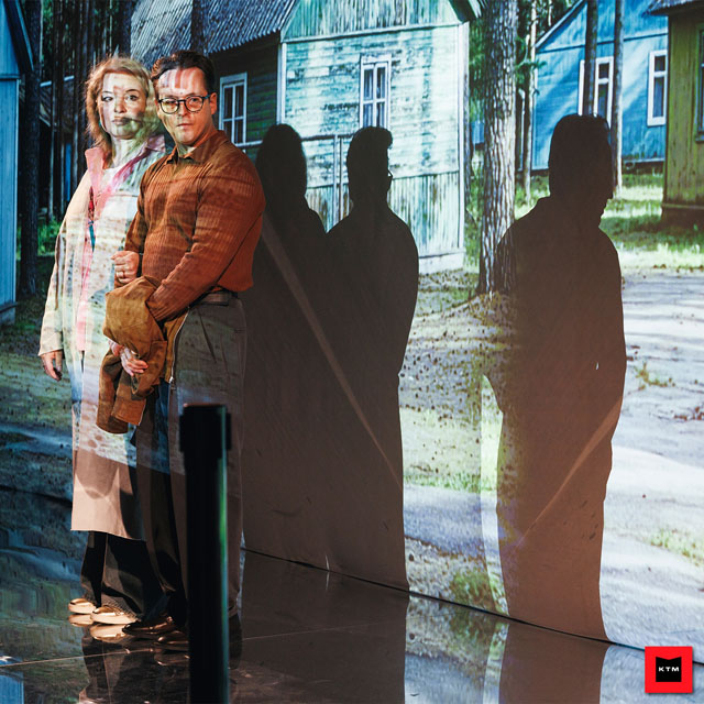 Сцена представляет собой длинную узкую полосу с зеркальным полом, в глубине ее (которая составляет от силы пару метров) — экран от стены до стены. Перед сценой — стойки с красной оградительной лентой, какие часто устанавливают в музеях. Вполне монументальное решение, которое очевидно конфликтует с камерным пространством театра, да и вообще не кажется игровым. Если в московском «Дяде», например, экран находился над сценой (к тому же был подвижен, перемещался), то здесь актеры буквально прижаты к стене. Иногда на нее проецируется синхронная съемка диалогов, происходящих за сценой (и, к слову, в абсолютно реалистичных декорациях), иногда — довольно абстрактные «декорации» в духе обложек Windows: сказочный лес, берег Финского залива, пейзаж деревни в Ленобласти.