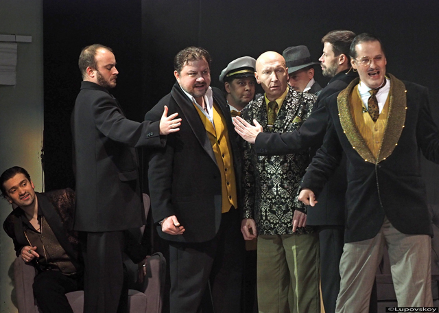 У спектакля есть спойлер. И этот спойлер — огромная, во весь портал сцены, картина в золоченой раме. Висит она на золоченой стене в такой же золоченой зале а-ля «дорого-богато» с кессонным потолком, переливающимися люстрами и дизайнерской мебелью в духе ар-деко. Живописное полотно велико настолько, что обрекает зрителя разглядывать его, пока не прозвенит третий звонок. Для непосвященных гугл в помощь: это картина американского живописца Томаса Коула «Крушение» из его пятичастного цикла «Путь империи».