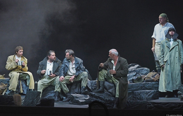 Герои окопной драмы — не полная и не намеренная противоположность этим ловкачам. Они не то чтобы в рапиде, но существуют в замедленном ритме, который от усталости души, от осознания бессмысленности происходящего. Война этих солдат Первой мировой идет уже третий год, и сил остается разве что на поддержание каркаса личности. Даже любовь — и только что зритель видел, как дорога она Леандру и Сильвии, — в окопе оказывается едва припоминаемым чувством. Командир Стенхоуп в исполнении Максима Керина (в очередь играет Даниил Шперлинг) — ранимый, глубоко трагический персонаж, выбравший показную жестокость и бесчувственность. Ему понятна глобальная игра интересов военного времени, и он глушит в себе человека: внутренне — отводя глаза и требуя от юного Рали, прежнего своего друга по мирному времени, обращения по военной форме, внешне — непрестанно отхлебывая из фляги. Осборн Тараса Епифанцева — хрестоматийный образ бывалого фронтовика, который младшим и отец, и нянька, и товарищ. Он тоже все понимает, и в его интонациях — и забота, и покорность обреченного на убой.