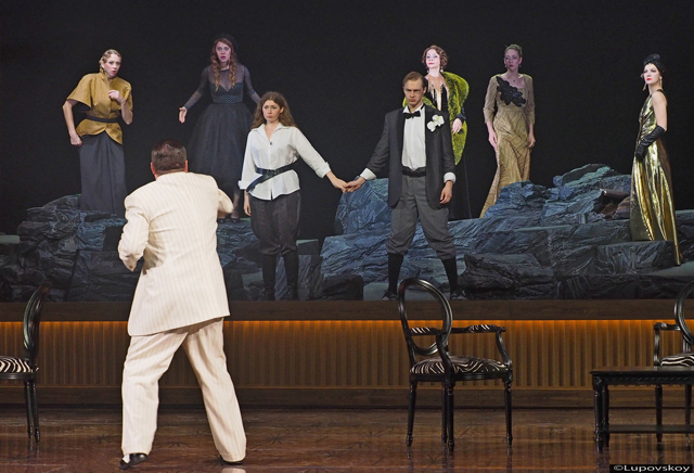 Постановочный аттракцион продолжится мощным взрывом — буквально низвергающимся из-под колосников потоком клубящегося дыма. Герои Шерриффа впрыгнут на авансцену с виски и шампанским в руках, но даже эта попытка заявить о своем существовании там, где о них не помнят, окажется безрезультатной. Ежась и озираясь, они будут говорить о войне, сидя на резных стульях и креслах, а герои комедии Бенавенте с легкостью отправятся на скалистые рельефы и как ни в чем не бывало начнут выстраиваться в живописную многофигурную композицию в духе салонных портретов. Их не смутит даже полный распад пространства — еще один постановочный ход художника. Где-то в глубине они продолжат свою едва слышимую игру в бирюльки и капризы, пока на авансцене будет умирать, отчаянно цепляясь за жизнь, смертельно раненый Рали (в очередь играют Максим Заболотний и Иван Канонеров) — чистый, трогательный и едва поживший юноша. И тех и других засыпят гигантские валуны — то ли глыбы разлетевшихся от взрывов скал, то ли внеземные карающие метеориты.