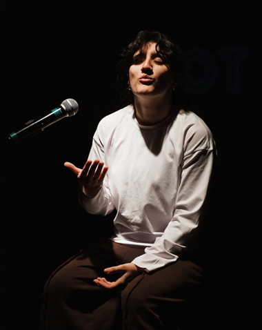 Рассказ о себе (он же — о семье, о корнях, о культуре) — это обнажение. Не всякий к нему готов: именно поэтому восточные женщины не ведут соцсети. Актриса же в процессе снимает с себя слои одежды. Сначала сбрасывает туфли на высоком каблуке: при болях в стопе они невозможны. Потом снимает кофту, шаровары, распускает густые черные кудри, остается в топике и шортах. И приходит в итоге к сюжетной ситуации стирки: буквально «стирает белье на людях», рассказывая о привычках рода.