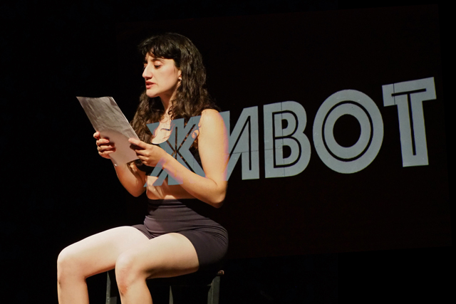 Этот поэтический, ассоциативный, болезненный текст очень сложно, кажется, преобразовать для сцены. Но молодой краснодарский режиссер Анна Додока увидела в романе материал для моноспектакля. Вернее, почти моно: в спектакле два актера. Основной монолог — Валерии Васславской; ее слушатель и свидетель — Антон Семко. Она — густобровая, с миндалевидными черными глазами; он — с орлиным тонким профилем, в кепке с мозаичным орнаментом — ориентальная специфика соблюдена в типажах.