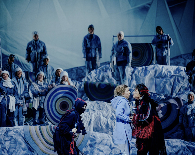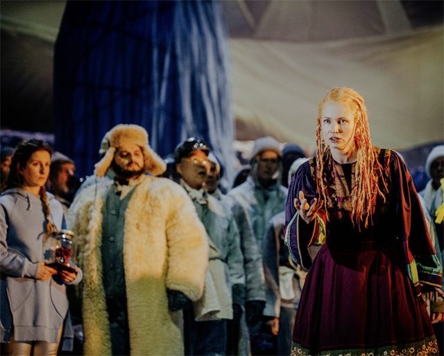 Возвращение к первобытно-общинному строю живущих на поверхности Земли предполагает заклинание жестокой природы, и обычно златокудрый дивноголосый Лель представлен в постановке мрачным шаманским существом с угрюмым взглядом. Он не то что не играет на рожке, но вообще двигается тяжелой угрожающей поступью (исполнительница роли Флерэнн Броквей волею случая к премьере вообще оказалась на костылях).