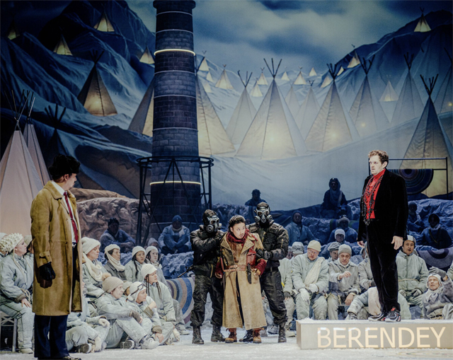 «Снегурочка» в Висбаденском театре — футуристическая фантазия на тему антропогенной катастрофы, соотносящаяся со вполне актуальными предсказаниями экологов и климатологов. Оставшаяся в мире горстка людей выживает в обстановке вечной мерзлоты и наступившего тотального похолодания. В чести законы племени, любой чужак — угроза. Оттого почти каждый, пробирающийся через белоснежный ландшафт, нуждается в оружии или вооруженной охране. Мороз и Весна в стороне от толпы: безумные ученые пропадают в экспедициях и возвращаются разве что для того, чтобы сбросить тяжеленные кофры и снова уйти в снега. Последний осколок жизни — изредка выезжающая большущая теплица Весны, где бережно хранятся и изучаются непутевыми лаборантами сохранившиеся образцы живых растений.