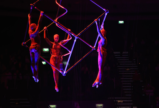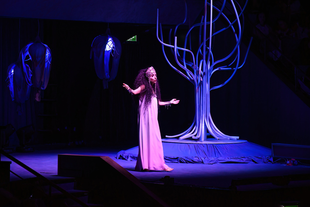 В своем сказочном саду над форгангом, освещенном диковинными цветами и деревьями-лианами, длинноволосая Нимфа в белоснежном одеянии (Нарине Мадунц) поет неведомые песни на неведомом языке. Герои так и не встретятся, возвышенное чувство окажется лишь путем в другие небесные сферы. В финале спектакля они воспарят, но случится ли их воссоединение, остается за рамками спектакля. Там, в вышине, и внизу на манеже расцветет в финале божественный сад, в который так и тянет погрузиться навсегда, оставив гнетущую реальность. Это движение по вертикали, взгляд в небесное неведомое оказывается в режиссерском решении главным мизансценическим и визуальным приемом. Цирк «Этернии» — это почти полностью цирк в воздухе, и воздушники тут — главные обитатели пространства.