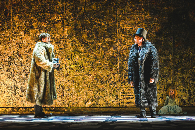 При этом зловещий Шприх — в спектакле Туминаса, например, игравший очень важную роль, — здесь убран и отчасти суммирован с Казариным (Анатолий Григорьев) в один роковой образ, управляющий игрой. А альтер эго Арбенина, или его второе «я» — Неизвестный — вдруг предстает маленькой девочкой (Алиса Смирнова в составе с Дариной Горбуновой), которая первой появляется в спектакле из-под поднимающегося занавеса, медленно раскачиваясь из стороны в сторону на качелях. В полной тишине, пока еще не видна вся картина, может показаться, что это виселица, некое предзнаменование конца, или образ времени, судьбы, мерно начинающей свой отсчет. Девочка сначала будто бы играет просто ребенка: подслушивает разговоры взрослых, перебегает по сцене, прячется. А потом ее образ начинает постепенно проявляться — с момента, когда она первый раз подносит Арбенину мороженое. А затем второй, третий… он отмахивается, но в конце концов все же берет яд.