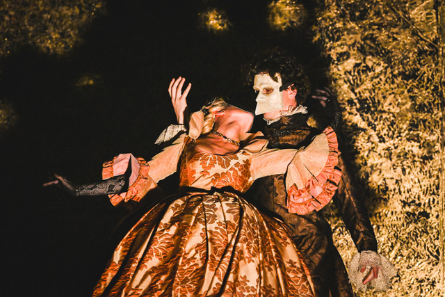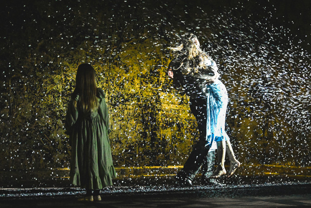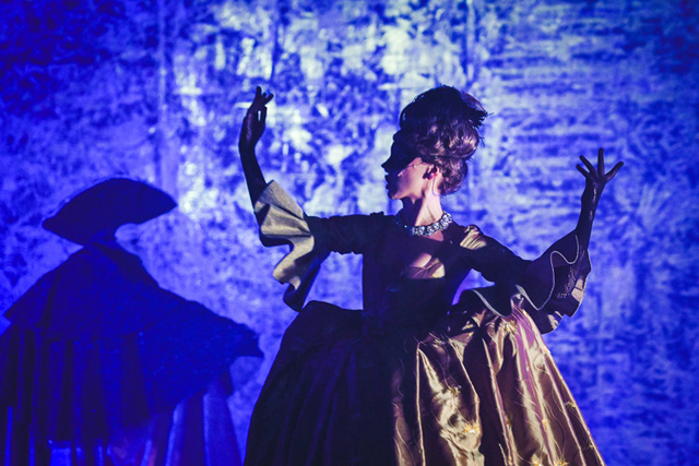 В центре сценографии — пустота, обрамленная позолоченной стеной. На нее же будет проецироваться пульсирующий неоновый свет в такт глухому музыкальному биту на маскараде, и стена будет обрастать гигантскими тенями. В спектакле Таганки это не танцы, не невинные развлечения, это действительно странное зрелище, где нет людей, а только фигуры, лица которых не просто спрятаны, а потеряны за масками. Здесь непонятно, что Нина могла делать на таком маскараде. Разве только случайно заблудиться. И само пространство отчасти напоминает ловушку дня сурка. В стене есть две двери, герои скрываются за одной и сразу появляются в другой на противоположном конце. Как будто нет времени, выхода, только прямо проложенный путь к концу.