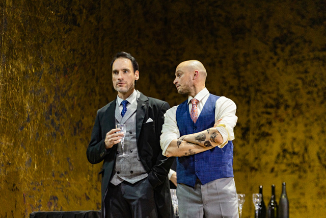 В сравнении с пространством вечной зимы в «Маскараде» 2010 года у Римаса Туминаса и подчеркнуто осовремененной действительности в стиле хай-тек в «Маскараде с закрытыми глазами» 2023-го у Петра Шерешевского, в спектакле Дениса Азарова и Дарьи Авратинской выбран промежуточный концепт, при котором все сжато до рамочной сути: абстрактный минимализм в сценографии (художник Алексей Трегубов) и деловые пиджачные костюмы у большинства героев вместе с условными бальными платьями на маскараде. То есть время приближено, маскарад отстранен, но это никак не влияет на обстоятельства. А лермонтовский текст вообще сильно сокращен, спектакль длится всего час с небольшим.