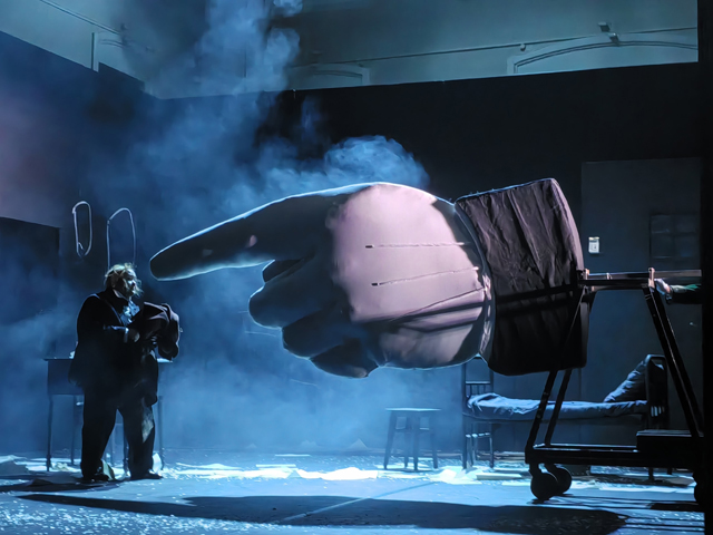 Так в спектакле Саровской драмы «Петрополь. Часть I. Шинель» (Гран-при) Акакий Акакиевич Светланы Киверской, маленький, толстенький, удивительно похожий на себя из норштейновского неслучившегося мультфильма, в поисках защиты судорожно семенит своими чуть косолапыми ножками по сцене и натыкается на… «ВЛАСТЬ». Представленную здесь разными частями своего огромного, из папье-маше, несоизмеримого не только с жалким Башмачкиным, но и вообще с человеческим, тела (всех других персонажей повести исполняет довольно крупных размеров артист Дмитрий Зонов). Нос, ножищи-ручищи, сапоги принадлежат — показывает нам режиссер-постановщик Антон Морозов — существам какого-то другого измерения, другого порядка. Порядка, где ты, человек, со своими бедами, чувствами, потребностями, мечтами, просто какое-то незначительное, надоедливое насекомое.