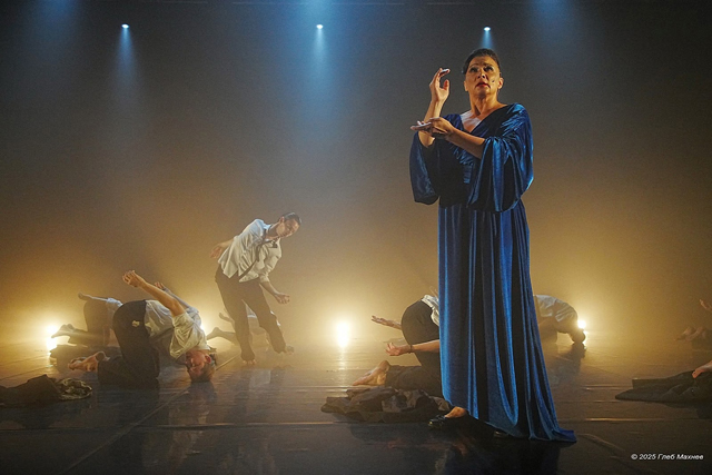В этот раз дирекция изменила своему правилу, и на фестиваль пригласили Театр Будто со спектаклем Ольги Цветковой «Колыбельная». Это местная, екатеринбургская труппа с недлинной пока историей — театр возник в 2021 году. Они занимаются буто, а этот вид японского современного танца в России выбирают славные ригористы, не принимающие требований «быть понятными» и (часто выдвигаемого пришедшими с мороза зрителями) «быть красивыми». Не красота, но выразительность — в общем, их можно назвать экспрессионистами, хотя они сами, кажется, стали бы сильно возражать. Группа позвала хореографа Ольгу Цветкову, что делит свою жизнь между двумя столицами (впрочем, ее постановки периодически возникают и в дальних далях) и получила спектакль, выстроенный как поэма о смерти.