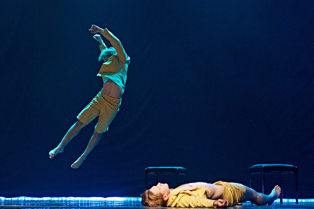Еще одной удачей можно назвать спектакль «Жили-были» омского Театра танца «нОга». Работы его худрука Ольги Горобчук много лет были синонимом бодрого и несмущающегося развлечения — чувство юмора, готовность использовать почти эстрадные приемы, бесконечная жизнерадостность всегда вносили оживление в программу любого фестиваля. Но нынешняя жизнь даже простодушных комедиантов делает философами — и Горобчук представила дуэт, в котором столько же напряжения и нерва, сколько и скрытого страдания, а в юморе отчетливо слышны болезненные нотки. Перед началом спектакля было объявлено, что «Жили-были» возник под впечатлением от повести Эрнеста Хемингуэя «Старик и море» — но угадать в дуэте Владислава Ювженко и Семена Носова знаменитую историю о рыбаке, преследующем гигантскую рыбину, а затем добирающемся домой в окружении акул, — почти невозможная задача. Ну да, один из артистов в начале втаскивает второго на сцену волоком, а в финале вытаскивает упакованного, как завернутая рыба. Но вся история — о сугубо человеческих взаимоотношениях, о распределении «сильный — слабый», о слабостях сильного и наоборот. Виртуозное взаимодействие артистов, когда тело одного мгновенно реагирует на движение другого, создание четкого впечатления, что по одиночке эти люди не существуют, пластические интонации, меняющиеся в секунду, движения, кидающие только намек на мысль — и настолько убедительный, что в головах зрителей этот намек становится реальностью. Останется ли «Жили-были» исключением из правил или театр пойдет теперь по совсем новому пути — пока неизвестно, но хочется верить, что Горобчук нас еще удивит, как и ее отлично выученные артисты.