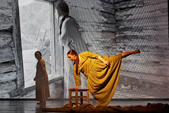 В один вечер с омским «Хемингуэем» был показан еще один дуэт — «ИзБа» тюменской компании Matterra. Московский хореограф Лика Шевченко сделала спектакль для Елены Данн и Виктории Мясниковой, в котором видео играет чуть не большую роль, чем движение на сцене. В этом видео, непрерывно транслирующемся на задник, две танцовщицы обитают в то ли недостроенной, то ли полуразрушенной избе в пустынном алтайском пейзаже. Каменистая почва, явный холод, ощущение, что в округе на сто верст больше ни одного человека. В отличие от «Жили-были», где артисты находятся в непрерывном контакте, в «ИзБе» танцовщицы держатся поодаль друг от друга — но от этого их связь не становится менее крепкой. На сцене они совершают обыденные действия, «работают по дому», а на экране — перебирают камни, надолго замирают, слушают ветер. В сумме — контраст и взаимодействие обыденности и вечности, прорисованные весьма выразительно.