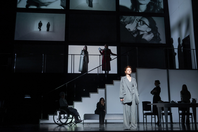 Детектив начинается с гостиной — такой штамп. Художник-сценограф Елена Сорочайкина создает аутентично-глянцевый интерьер нулевых, отображающий былое богатство. Перед нами трехуровневое пространство: гостиная с обеденным столом, креслом и журнальным столиком; лестница, ведущая на галереи второго этажа; большой экран, куда транслируются девять ячеек видеонаблюдения — из каждой комнаты в доме. Декорация сделана таким образом, что в нужные моменты контровым светом обнажается находящееся за стенами, и мы видим силуэты-тени персонажей (конечно же, в самые уязвимые моменты). «Герметичность» детективного места преступления тут нарушена — режиссер и сценограф, иронизируя над жанром, утрируют очевидность происходящего: в любое время мы можем подсмотреть за кем угодно, полифоничность действия позволяет подключиться к каждому персонажу в любом порядке и так далее. Поначалу Константин Соя и вовсе упрощает элемент детектива, раскрывая все карты: в комнате Габи мы видим собранный чемодан; Огюстина на наших глазах избавляется от таблеток; бабушка то и дело наливает себе виски и проч. Более того, создается ощущение единого смыслового поля: здесь в принципе невозможно что-то скрыть — все происходит одномоментно, параллельно и открыто, словно бы в воображении одного человека. Но об этом — позже.