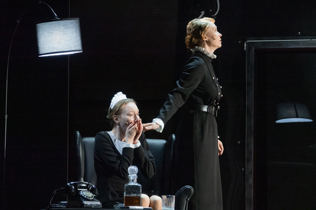 Константин Соя заигрывает с нуарной киноэстетикой (видеоарт Андрея Калянова). Трансляции из белых комнат периодически сменяются крупными планами лиц и тел героинь, романтическими сценами взаимодействия Марселя с женой Габи / любовницей Луизой. Крупные планы позволяют иначе взглянуть на восемь женщин — они очеловечиваются, раскрываются психологически. Петлички-микрофоны на актрисах делают их голоса специфически-неестественными, будто «озвученными» для фильма. Дополняет этот киновизуал черная метель на белом фоне, которая во втором акте инверсируется — в белую метель на черном. Звучит, конечно, загадочная «детективная» музыка; периодически действие прерывается звуком затвора фотоаппарата. И тут мы приближаемся к главному — появление каждого персонажа сопровождается голосом Катрин.