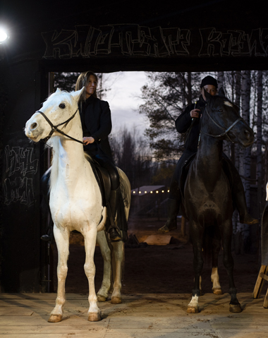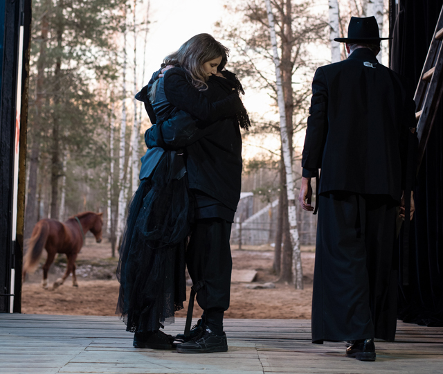 Во-первых, трясясь с ухаба на ухаб по бездорожью и распутице Всеволожского района, к спектаклю ты приезжаешь, в общем-то, уже полумертвый. И попадаешь к тому же реально на какой-то край света, где поблизости — только завод по переработке мусора, то есть по переработке отходов жизни (дорога раздолбана еще и потому, что один за другим ее утюжат мусоровозы). Сайт-специфический эффект обеспечен. Но одновременно (и это «во-вторых») ты попадаешь в театр на природе, в лесу, в театр, где, по определению, животные, прекрасные кони Евгения Ткачука — цари и герои, в то время как в мире прилепинских фантазий образ того света — это некий Воронеж-ад, в котором, как уже было сказано, нет ни одного животного. Там и пища не имеет вкуса, и пиво безалкогольное, и сексом лучше не заниматься — не зайдет. Философия места (театра «ВелесО» с его художественной иппотерапией и живым ландшафтом) и пьеса-фантазия об условной не-жизни парадоксально смыкаются.